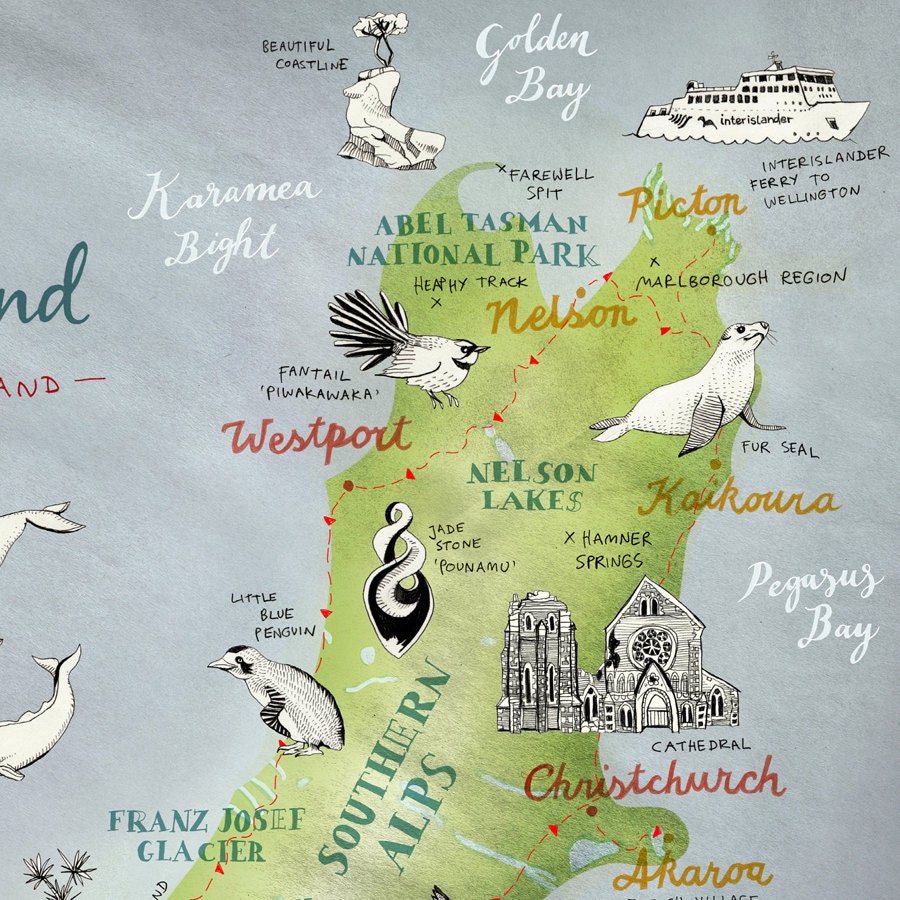 Large Print New Zealand Map Of South Island Large Nz Print Etsy